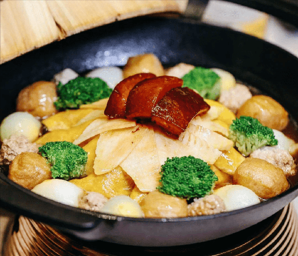其實,李鴻章雜燴這道菜很有講究,事先要做過“前期工作”。如以雞雜、肚片、火腿、面筋、香菇、山筍、海參等墊底,用麻油酥燒,然後裝入陶盆,點以白酒、醬油等佐料,放在炭基上用文火慢燒,直至油清菜熟方原盆上桌。