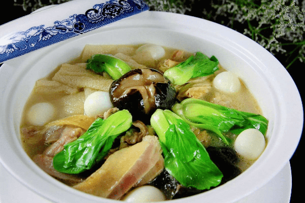 2、用一品鍋1隻,裡面放膠菜心、魚肚、海參打底。然後將鴨子、火 腿筒、雞,蹄膀依次圍在上面的四周,中間放鴿子,成後一個梅花形;外面再圍上10隻雞蛋,每隻雞蛋上面放一片火腿和一片冬筍;另將青菜心放在鴿子上面, 最後加上雞湯和味精,上籠將湯蒸開後,放在木炭爐上一起上席,適宜於冬季。