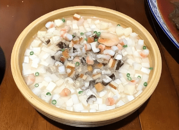 原料:豆腐,蝦米(以淡水蝦米為佳),鮮瘦肉火腿心, 水發香菇,鮮冬筍尖,食鹽,鮮板油, 蔥花各適量。