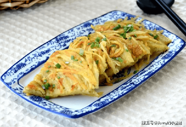 鍋內加油,放入土豆絲面糊,用鏟子將表面抹平,開小火煎幾分鐘。