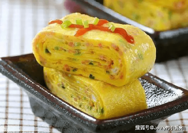 最後將厚蛋燒切成小塊,就可以食用瞭。如果孩子愛吃番茄醬,可以擠一點增味。