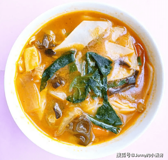 然後倒入適量清水,放入豆腐、木耳、冬瓜,大火煮兩分鐘,再倒入面片、青菜,煮到熟透。