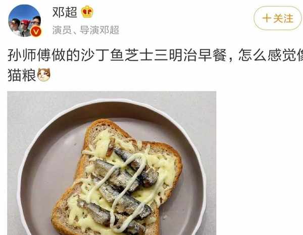 連著幾天鄧超都在微博曬出孫儷做的一些美食,前天曬烤紅薯,昨晚曬孫儷做的佈裡修,今早起鄧超說孫儷做的早餐像貓糧,真是娛樂圈一對快樂的夫妻,就算娘娘做的再不好吃,超哥你也要硬著頭皮誇媳婦兒做得好!