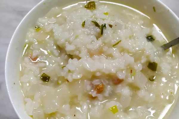 4、炒鍋中倒入少量油將肉沫煸炒出油,放入蒜苗和白蘿卜炒香,加入適量鹽和雞精炒勻,然後倒砂鍋中混合均勻,小火慢慢把粥煮至濃稠狀即可。