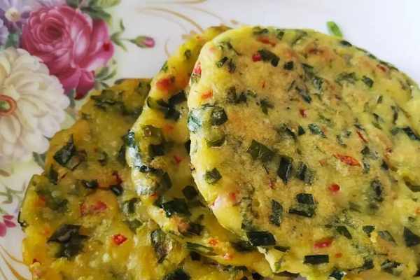 2、加上點兒青椒、青菜、小蔥,放點兒鹽和雞精,然後揉成一個個小圓餅放到電餅鐺中烙熟,根據個人情況可以放油也可以不放油,做出來的餅外焦裡嫩,味道還是很好吃的,當早餐很不錯。