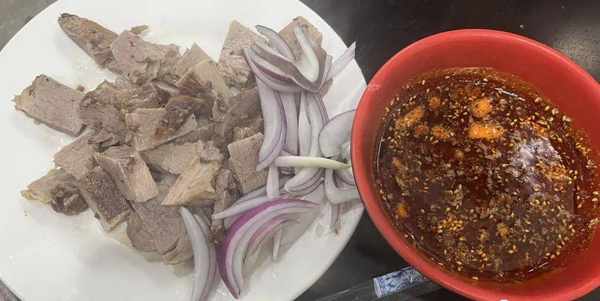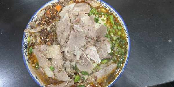 小心翼翼端著我那碗湯汁滿溢的超級豪橫的羊肉餄餎面往小桌上躑躅前行時,正看見一個也操著北京口音的大爺要瞭半斤牛肉,就看那一個鐵盤放瞭幾大塊切割非常不規則的牛肉,看著就香。