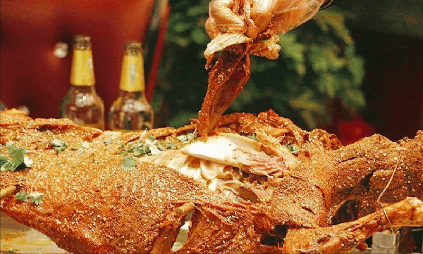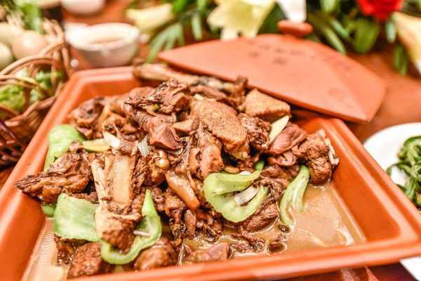蒙山羊屬絨毛皮肉兼有型優質地方羊種,性靈敏活潑,善於爬山,能在懸崖陡壁上采食。蒙山羊全身是寶,其肉質細嫩,營養豐富,除含有豐富的蛋白質和脂肪外,還含有較高的鈣、鐵、磷等無機鹽和維生素A、維生素B等,具有很好的藥用價值,能暖中補虛,益腎壯陽,開胃健力,利肺助氣,豁痰止喘,養肝明目。蒙山烤全羊以1—3年的純蒙山山羊為原料,配以蒙山天麻、當歸、陳皮、香葉、青果、白芷等二十種中草藥,放置爐上燒烤而成,外形完整,色澤金黃,外酥裡嫩,食而不膩,深受顧客的歡迎和好評。