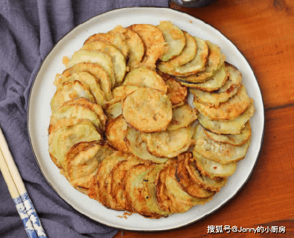 鍋內加油,開小火預熱。茄子放進蛋糊中裹上一層,再放進鍋內,煎到兩面金黃。