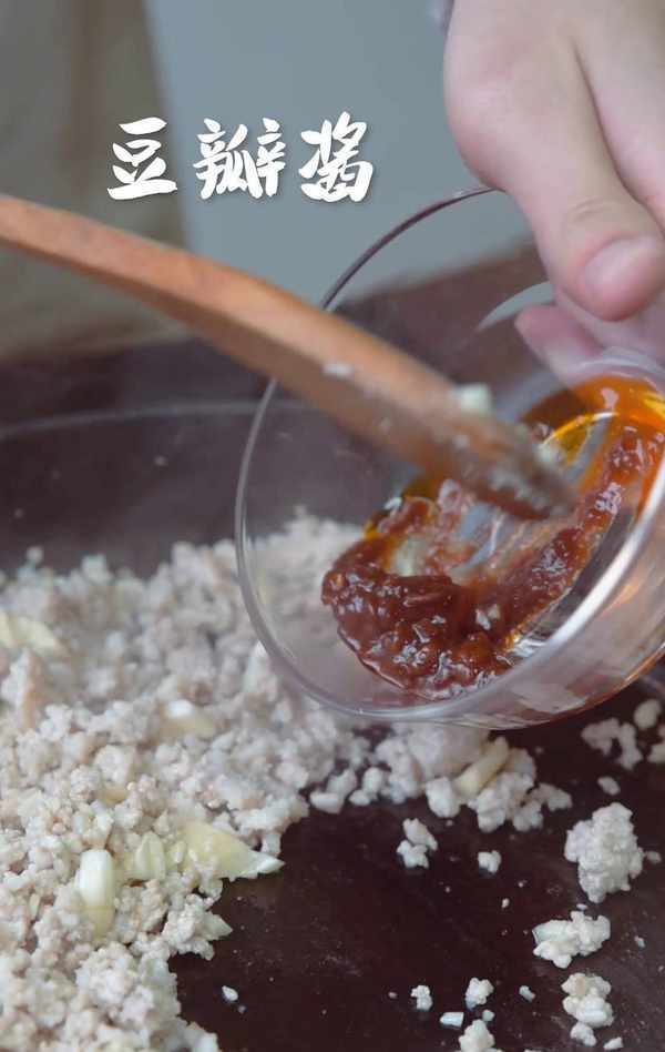 2.熱鍋把肉末炒香後,加入蒜蓉翻炒,翻炒幾下後加入豆瓣醬繼續翻炒;