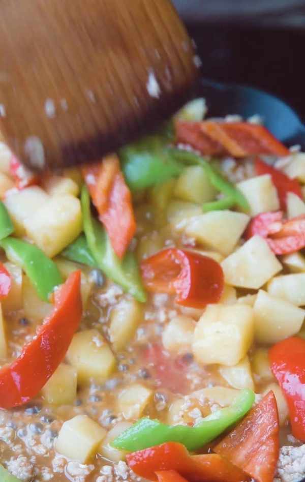 將豬肉末炒出變色後加入蒜蓉跟豆瓣醬,香味撲鼻,放水燜一燜,再加入土豆和青椒,調味後煮到土豆變軟就可以瞭,十分鐘就做好,一點也不難。