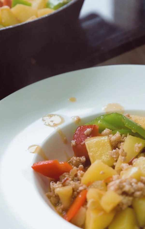 2.豬肉最好選用間隔均勻的五花肉,油脂豐富,這樣做出來的肉末土豆更加香