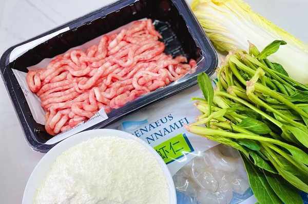 制作過程:1、首先我們要準備好制作這道【娃娃菜豬肉蝦仁餡餃子】需要用到的所有食材:面粉400g、肉餡300g、蝦仁100g、娃娃菜150g、菠菜100g、大蔥30g、薑20g、雞蛋1個。