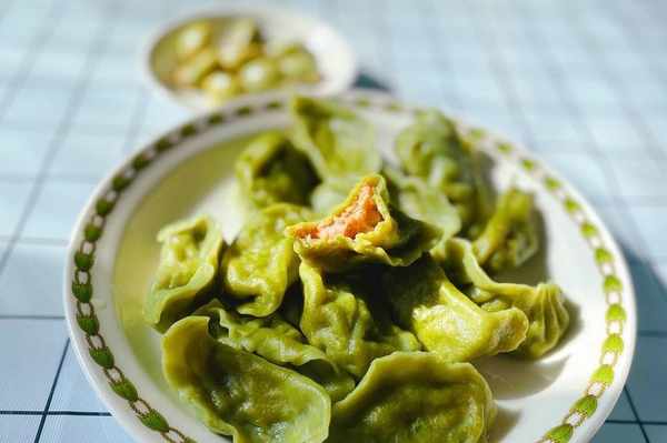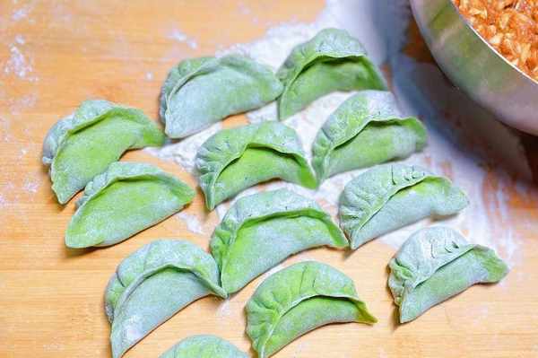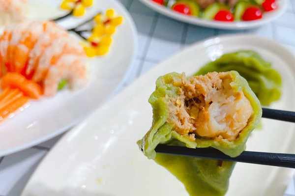 娃娃菜豬肉蝦仁餡餃子主料:面粉400g、肉餡300g、蝦仁100g、娃娃菜150g、菠菜100g