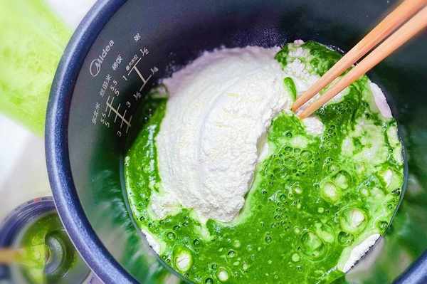 2、先把菠菜清洗幹凈後切段放入料理機中加入清水,攪打成菠菜汁,將打好的菠菜汁倒入面粉中,用筷子攪拌成面絮,再用手揉成光滑面團,然後蓋好放置一旁餳面30分鐘左右。