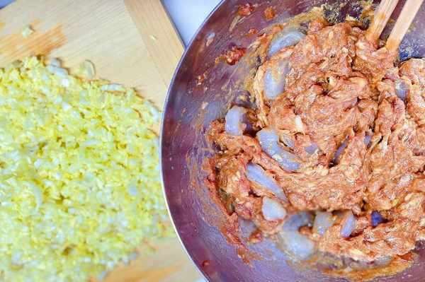 3、接下來我們來制作餃子餡:先將娃娃菜掰開放入水中清洗幹凈,控幹水份後放到案板上用刀剁碎,再把大蔥和薑分別切成蔥薑末。將肉餡放入料理盆中,放入蔥末和薑末,調入老抽5ml、蠔油5ml、生抽10ml、料酒10ml、鹽1g、香油5ml、十三香1g,攪拌均勻後打入1個雞蛋,用筷子朝一個方向攪打上勁兒。最後加入蝦仁和之前剁好的娃娃菜攪拌均勻即可。