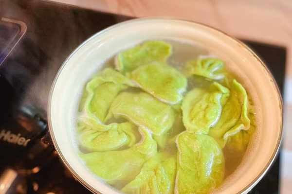 6、湯鍋裡加入適量飲用水大火燒開,待水沸騰後下入餃子,煮至餃子浮起時揭開鍋蓋點入適量涼水,繼續蓋蓋兒煮,然後再煮至餃子浮起時再點一次水,等餃子第三次浮起時就可以關火出鍋瞭。鮮香味美的娃娃菜豬肉蝦仁餡餃子就可以開吃瞭。