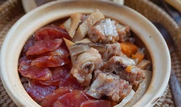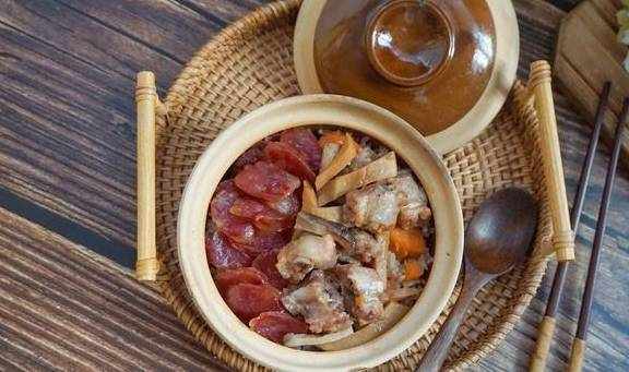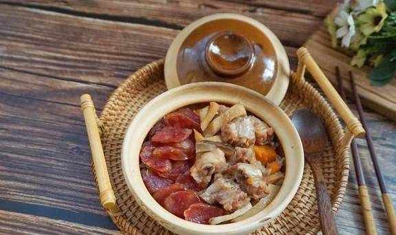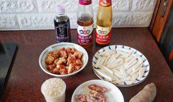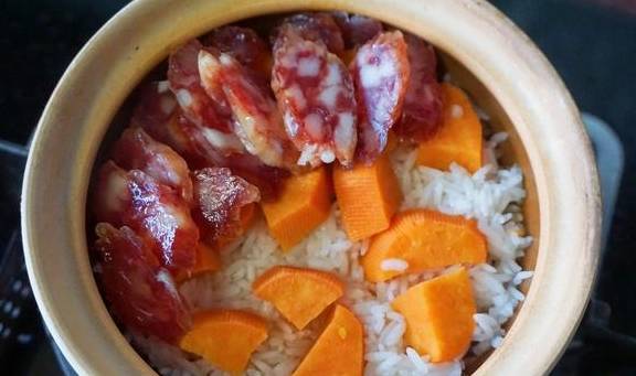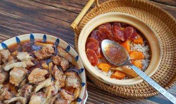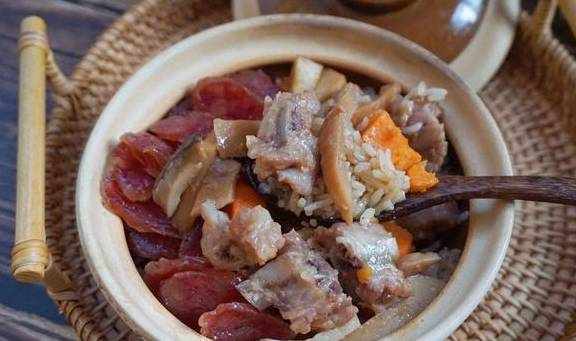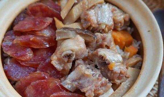 【排骨臘味雙拼煲仔飯】排骨2根,廣式粒粒臘腸5根,杏鮑菇1個,米2量杯,紅薯1個,輕鹽醬油15毫升,蠔油10克,料酒5毫升,清水適量