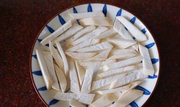 4、杏鮑菇洗凈切成小長條狀,平鋪放入盤裡