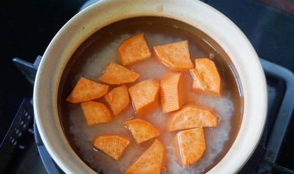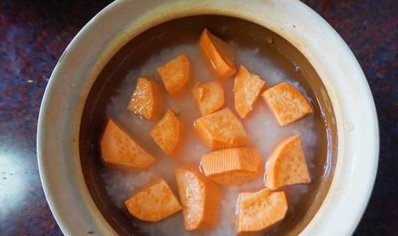 7、紅薯去皮洗凈後切小塊,放入浸泡好的米中