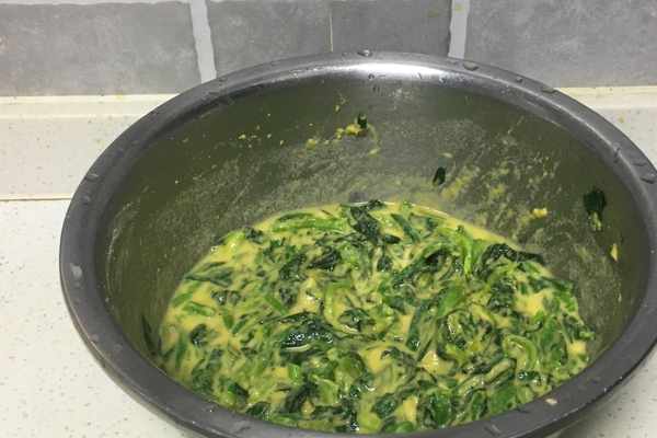 3、將過清水的菠菜攥幹水分,然後切成1CM左右的細段,裝入盤中,再磕入雞蛋,調入適量鹽和五香粉,少量多次倒入玉米粉,攪拌成略微粘稠的面糊;註意:玉米粉也可以替換成普通面粉、全麥粉等等;