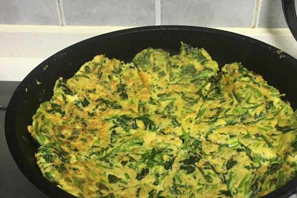 5、左右前後晃動煎鍋,看看煎餅是否定型,定型後掂鍋翻面,直至煎至兩面金黃熟透,分割成小塊即可;如果不能掂鍋翻面,也可以將平碗倒扣在鍋中,接著將平底鍋翻轉過來,再將煎餅滑入鍋中;