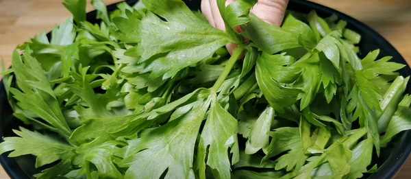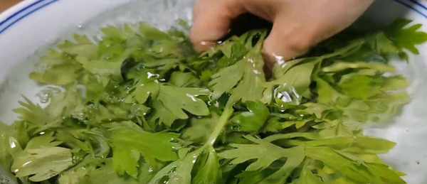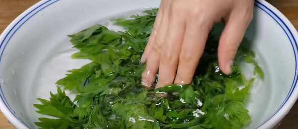 1、把芹菜的葉子摘下來之後,給它放在一個大碗中,再倒入足夠的清水沒過芹菜葉,然後再放一勺食用鹽,把芹菜葉給它浸泡一下,這是因為芹菜葉表面會有大量的農藥殘留,用鹽水泡一下,能夠去除農藥的殘留和一些雜質,還能夠殺菌消毒。