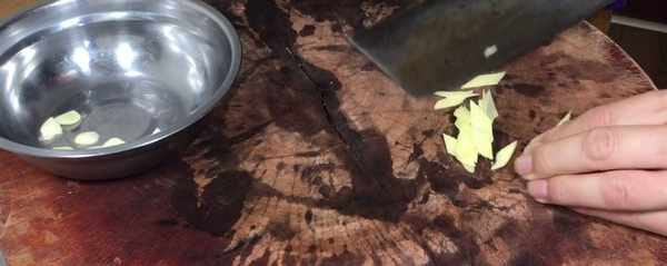 2、現在準備一點小料,先將蒜切成蒜片,然後生薑去皮,也給切成菱形片,放一旁備用。