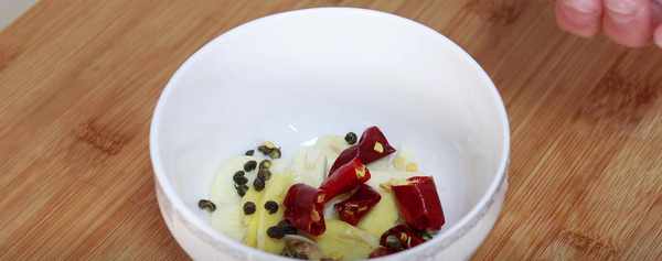 3、準備一些生薑給它切片,再來兩粒大蒜也切成片,然後裝進碗裡,再放上一點幹海椒、幹花椒進碗裡備用。