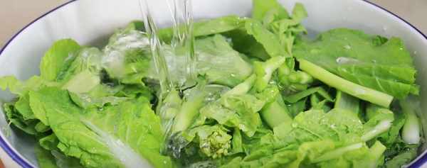 2、接著在處理好的白菜苔上,加入一勺的食用鹽,再倒入適量的清水,給它浸泡10分鐘,用清水多清洗兩遍,洗好控幹水分備用。