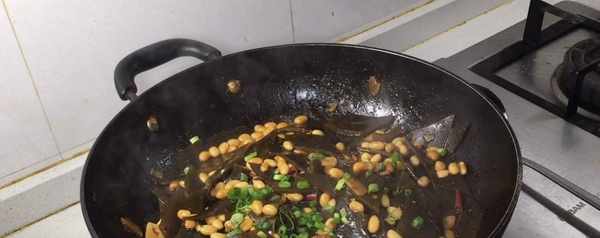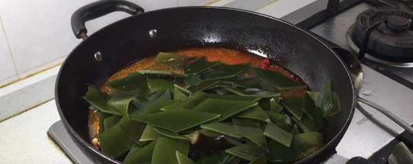 9、開鍋後撇去表面的浮沫,然後轉小火,蓋上蓋子燜至30分鐘左右,至湯汁完全被海帶吸收,快速翻動炒鍋。