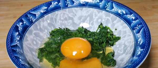 5、然後再打入2到3個雞蛋,不用放太復雜的調料,隻要放點食用鹽,然後用筷子攪拌均勻即可,芹菜的葉子有種特別清香的味道,如果是放的調料太多太復雜的話,就會搶走這個香味。