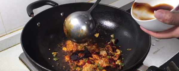 6、炒出香味後,加入一勺十三香,再放入少許幹辣椒段繼續煸炒,加入30克左右番茄醬,煸炒出紅油,用來提味提色,加入十克蠔油提味提鮮,小火繼續煸炒出香味。