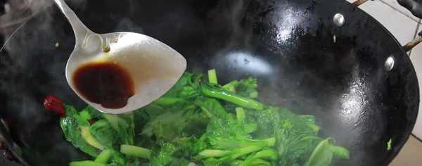 5、炒上兩分鐘後,放上一點食用鹽,少放一點雞精,翻炒兩下,把調料化開,出鍋的時候,沿著鍋邊淋上一點香醋,這樣炒出來的白菜苔更加脆嫩。