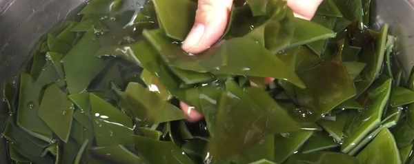 1、準備一些海帶,將表面的鹽微微洗幹凈,就將海帶放案板上,給它切成菱形塊,再放入清水盆中浸泡兩個小時左右,讓它能充分去鹽。