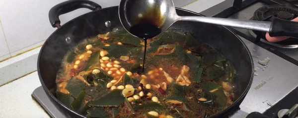8、現在開始調味,加入一勺東古醬油,再來一勺陳醋,最後來一點老抽調整顏色,加醋的作用是使海帶更加酥爛,第二個能夠中和味道,現在加入適量的鹽、味精、雞精、白糖提味提鮮,再加入少許胡椒粉增香。