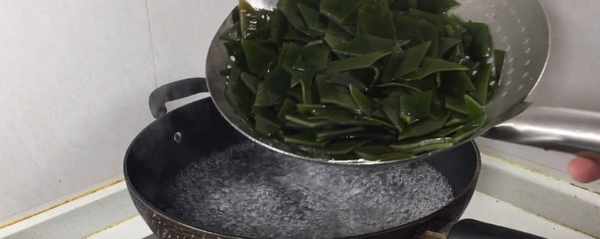 3、燒一鍋開水,將海帶片放入鍋中焯水去鹽,然後去除海帶的異味,再用清水過涼。