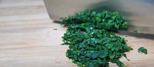 4、過瞭冷水之後,把水分給它擠幹,然後再把芹菜的葉子改刀切成碎末,切好之後,把它放到碗中。