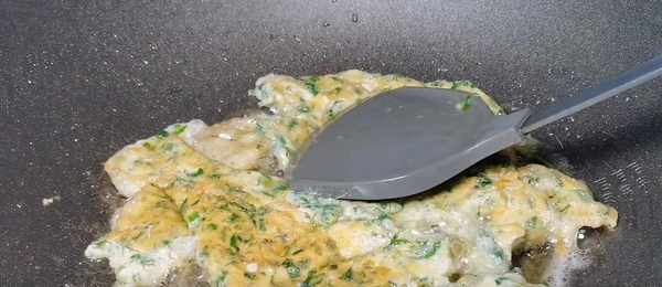 6、起鍋燒油,再把蛋液放到鍋裡面去,小火慢煎,把雞蛋液煎至兩面微黃,煎魚或者是做湯的時候放點芹菜葉,可以去除腥味,如果是不喜歡這樣吃的話,可以把芹菜葉來做涼拌。