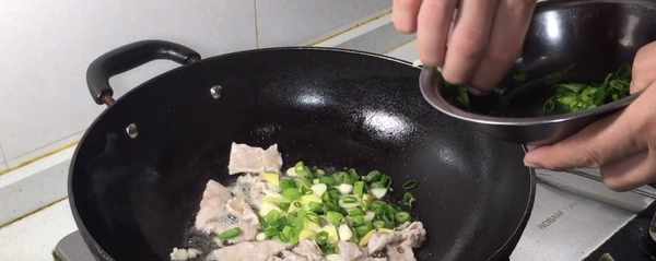 5、起鍋,放入一勺色拉油,燒至三成熱左右,將肉片放入鍋中小火煸炒,煸炒至肉片變白斷生後,放入大料,烹入少許料酒去腥,放入蔥、薑、蒜,小火繼續煸炒。