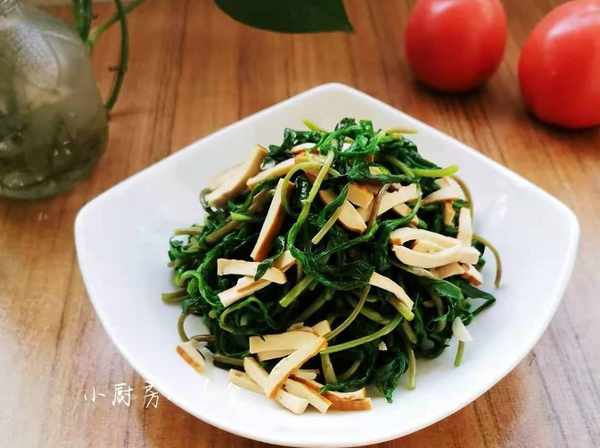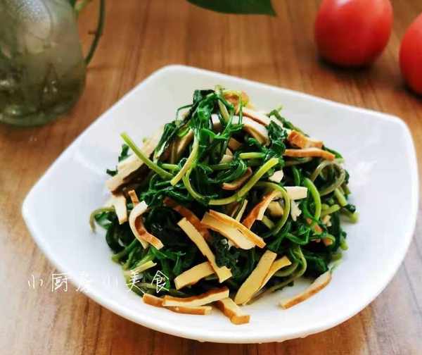 步驟七:馬蘭頭拌香幹做好瞭盛出來裝入盤中,用筷子翻動幾下,盡快散掉熱氣,防止葉子變黃,影響口感。