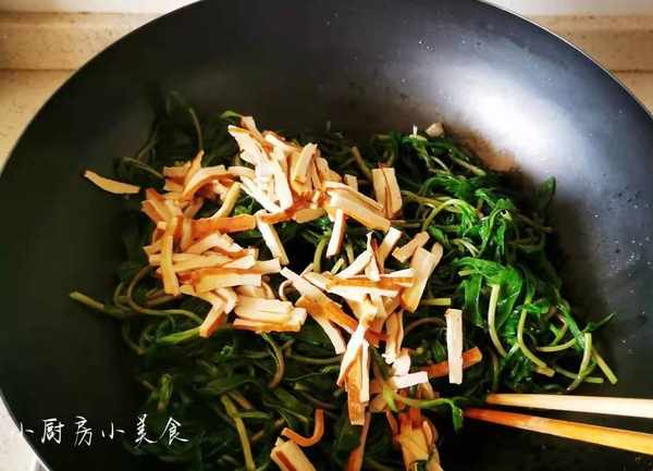 步驟五:放入焯過水的馬蘭頭翻炒兩下,放入香幹,放入適量鹽,雞精翻炒均勻即可。喜歡放糖的可以適量放一些糖提鮮。