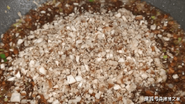5.香菇炒香後倒入半碗開水,加入適量的老抽、 1勺蠔油、1勺雞精、1 勺白糖,翻炒均勻,這個時候要用鏟子不停翻炒攪動,防止粘鍋底。大約炒制5分鐘左右,把水分炒幹,醬料熬制濃稠,讓所有食材的香味都充分融合後就可以盛出來瞭。