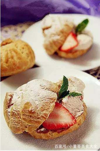 8)將涼瞭的泡芙從中間剖開,加進草莓冰淇淋和新鮮草莓,再合攏泡芙,撒上糖粉即可。