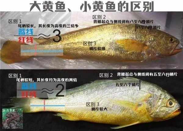 首先,小黃魚和大黃魚在形態上就又明顯的區別,小黃魚的尾柄長大約是高的2倍,而大黃魚是大約為3倍,小黃魚的體長是頭長的3倍以上,頭長是雙眼距離3.6-4.6倍,而大黃魚的體長是頭長的3.6-4倍,頭長是雙眼距離的4-5倍,這就是說,個體大小一樣的兩種黃魚相比較,大黃魚顯得尾柄要細一些,頭要小一些,眼睛也小,此外,兩種魚體在背鰭和側線之間的鱗片大小和數目也有區別,小黃魚的鱗片大而稀疏,大黃魚的鱗片小而密集。