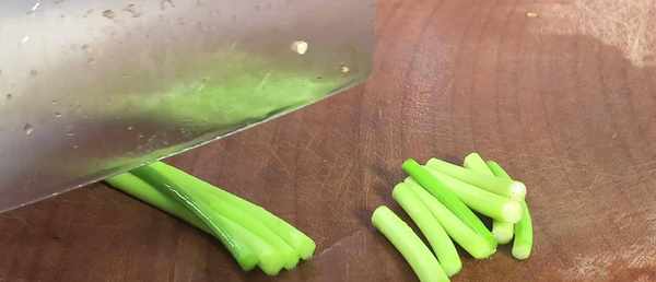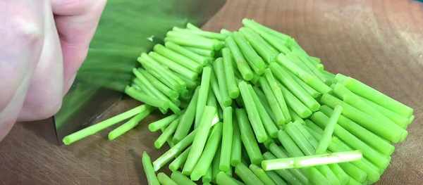 4、準備四根蒜苔,也將它切成三厘米長的小段,切好之後裝入碗中備用。