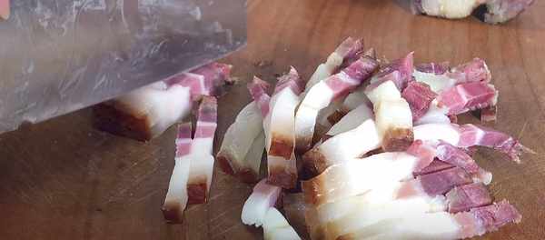 5、這時臘肉也煮得差不多瞭,用勺子將它撈出,稍微放涼以後,將它放在砧板上,切成八毫米寬的薄片,再改刀切成四四方方的長方形,全部切好之後,將它裝入碗中備用。