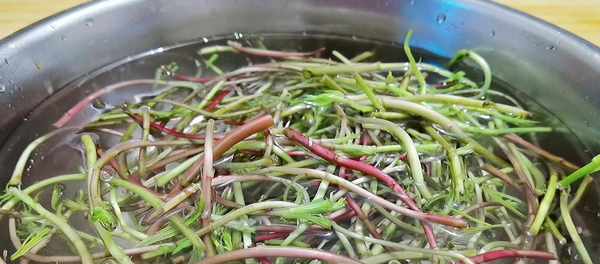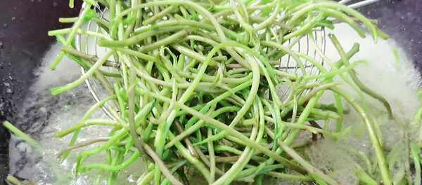 4、焯水隻要兩分鐘,時間不宜過長,不然吃起來就不脆爽瞭,將野藜蒿撈出,放在涼水中過涼,再瀝幹水分備用。