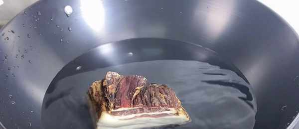 1、首先準備一小塊臘肉放入鍋裡,然後往裡加入一小勺鹽,這樣是為瞭去除臘肉的咸味,接著轉大火將它煮上10分鐘。