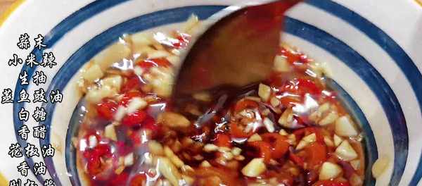 5、在放蒜末和小米辣的碗中,淋入剛燒開的熱油,激發出它們的香味,再加一勺生抽,兩勺蒸魚豉油,一點白糖,一勺香醋,一點花椒油,少許香油,有剁椒醬的,可以加一點剁椒醬,最後攪拌均勻即可。