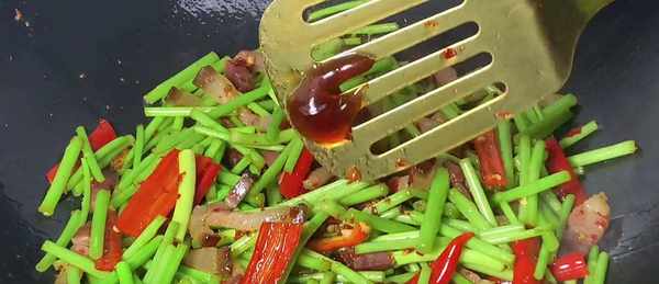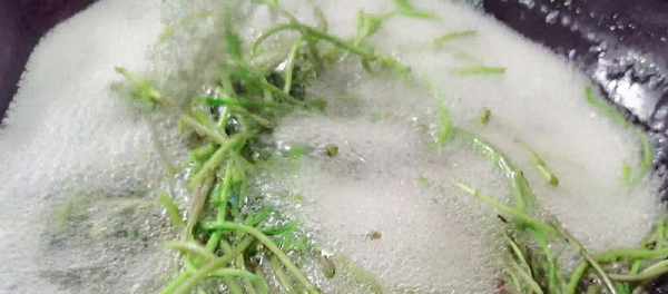 7、等油脂也爆得差不多瞭,倒入切好的藜蒿,開大火快速地翻炒,放入辣椒絲,繼續翻炒均勻,喜歡吃辣的,可以再放一點辣椒面,當然也可以不加,再加入少量的食鹽,一點點生抽,其它的調料就不用放瞭,快速的翻炒,將藜蒿炒至斷生。
